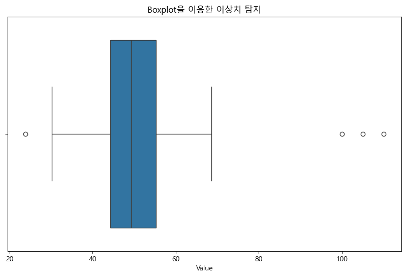 - 박스플롯(Boxplot): 박스플롯은 데이터의 분포를 시각적으로 보여주는 도구로, 이상치는 보통 플롯에서 상자 밖에 점으로 표시된다.